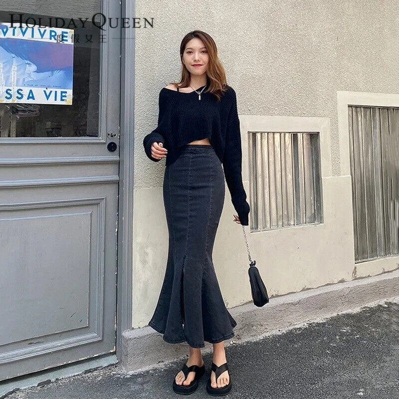 HolidayQueen New Spring and Summer Denim Skirt Female Design Sense High Waist A-line Ruffled Mid-length Bag Hip Fishtail Skirt Free Shipping HQP0126