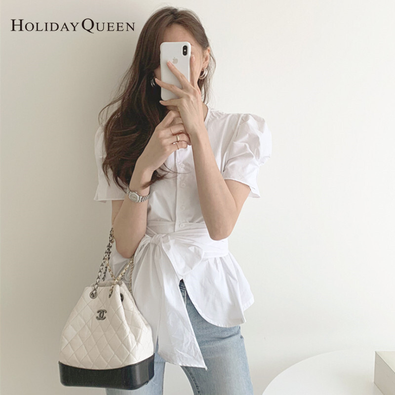 HolidayQueen Summer Puff Sleeve Tie Waist Waist Thin Chic Short Sleeve Shirt S M Free Shipping HQ0436