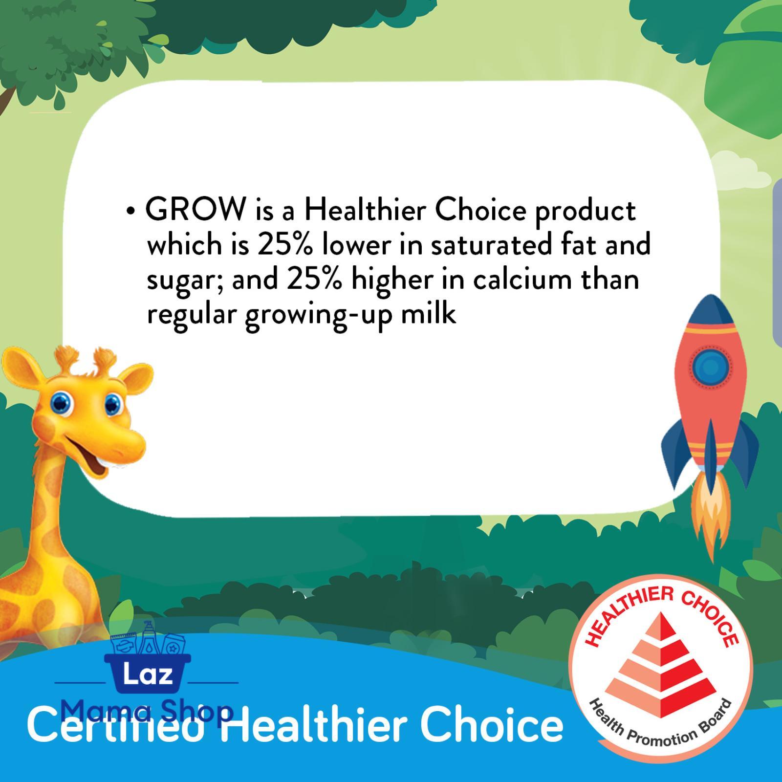 GROW is a Healthier Choice product which is 25% lower in sugar and 25% higher in calcium than regular growing-up milk. ^In comparison to previous formulation for GROW School +For children up to 6 years of age