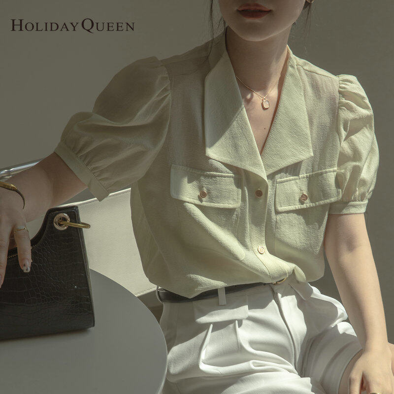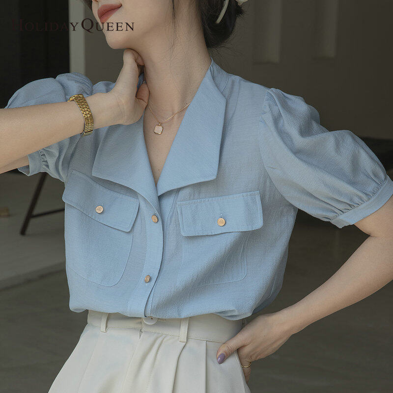 HolidayQueen Ladies Puff Sleeve Shirt Summer New Fashion French High-End Blue Top S M L XL 2XL Free Shipping HQ1302