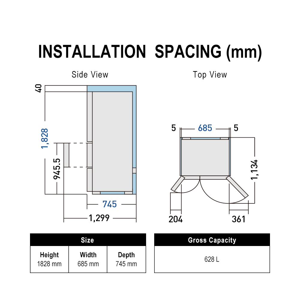 H: 1828mm, W: 685mm, D: 745mm, Weight: 114kg. *Please check the minimum space requirements for installation.