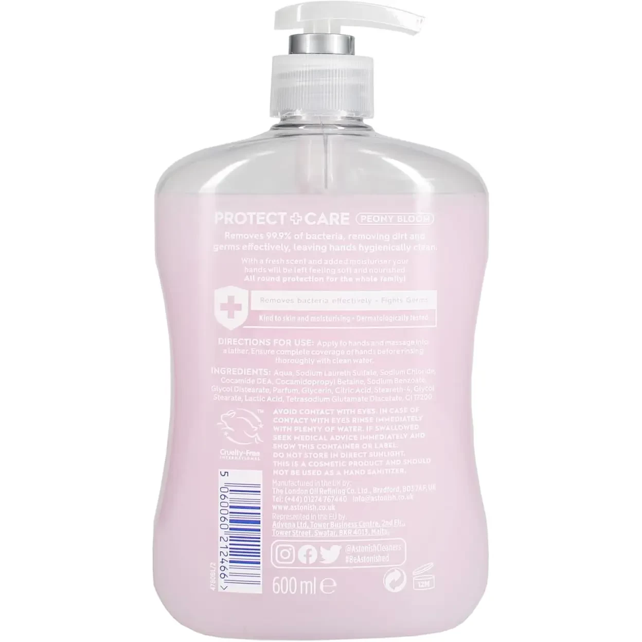 - Removes 99.9% of Bacteria: Astonish Protect + Care Peony Bloom Handwash effectively removes 99.9% of bacteria, ensuring hands are hygienically clean.