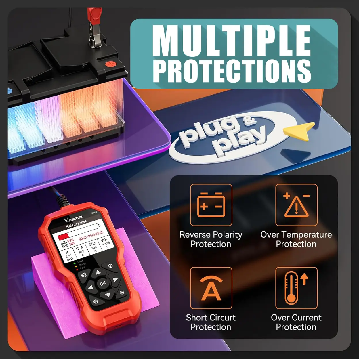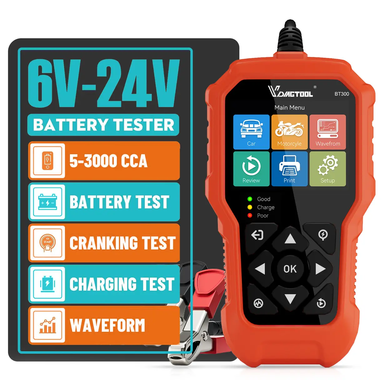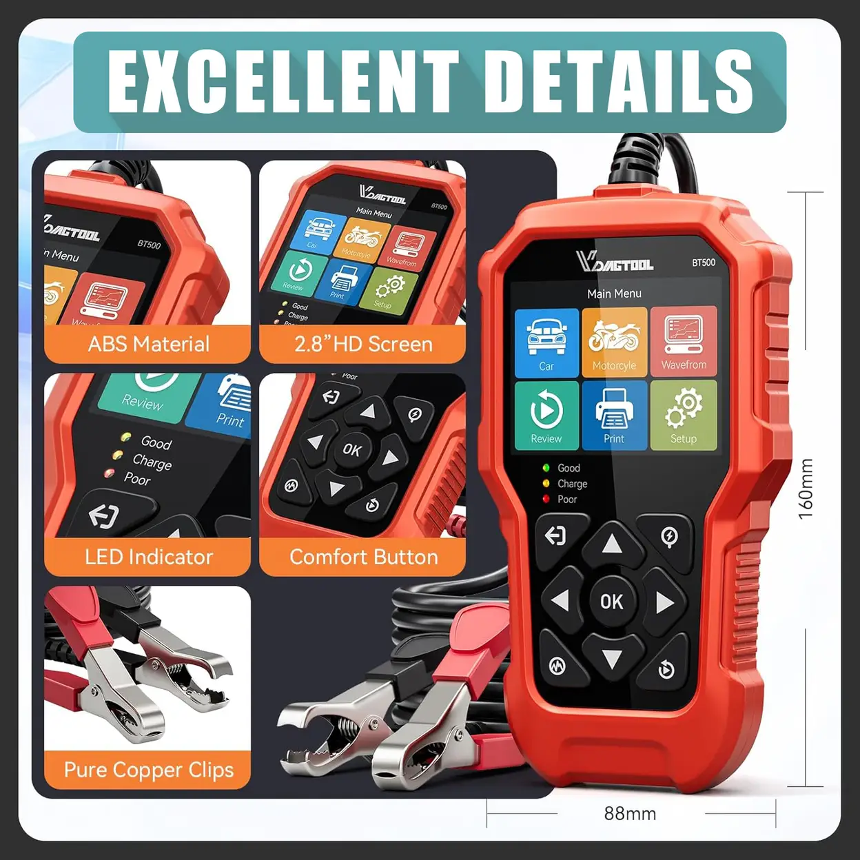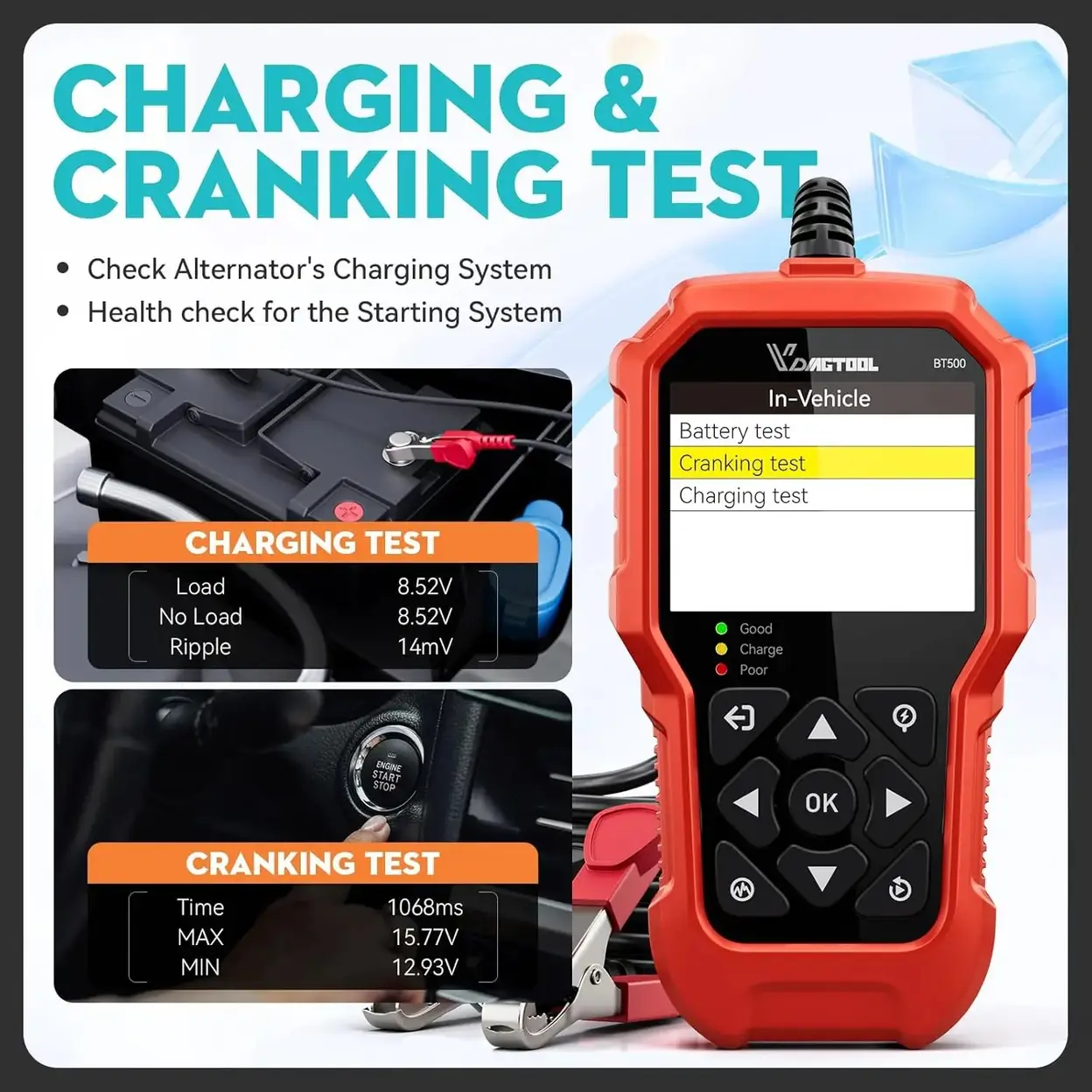 Battery Tester Car 6 V 12 V 24 V VDIAGTOOL BT500, 5-3000 CCA Battery Tester Car, Starter Alternator Battery Gauge, Battery Guard Charging Crank System for Car Truck Motorcycle SUV ATV Boat