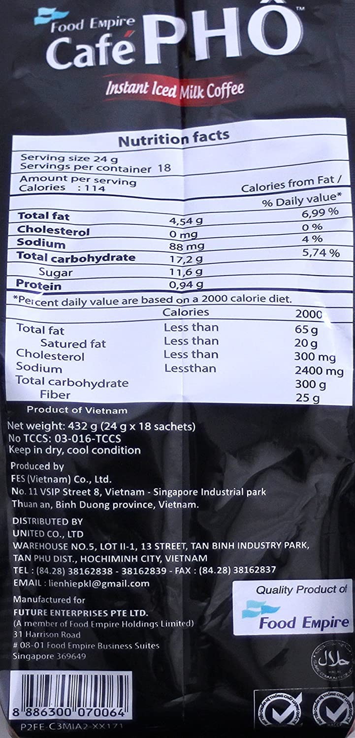 Cafe Pho Vietnamese 3in1 Instant Coffee Mix, Iced Milk Coffee, Cafe Sua Da, Single Serve Coffee Packets, Bag of 18 Sachets, Pack of 1-15 Months Shelf Life