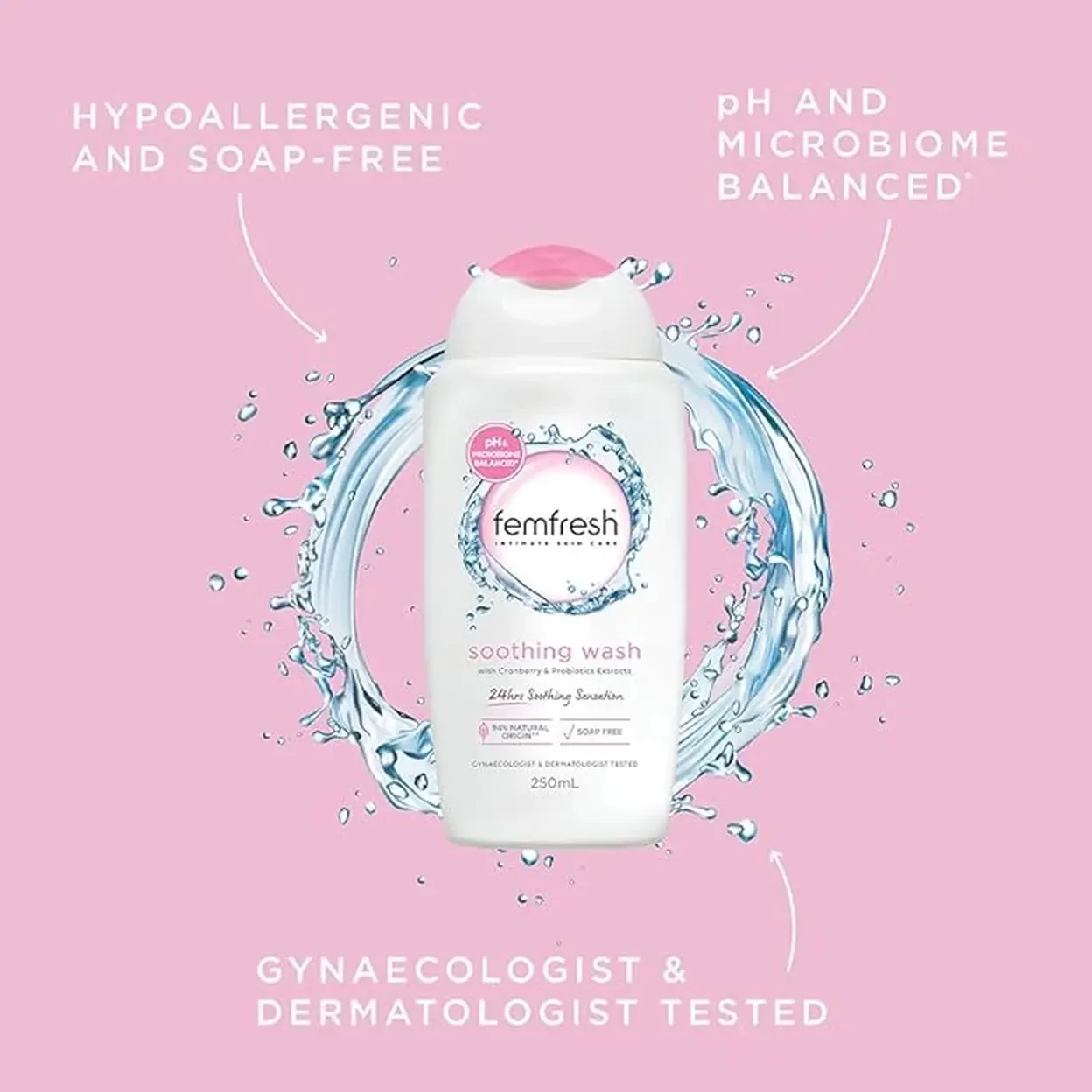 Femfresh Soothing Intimate Wash 250ml is a gentle, everyday solution for feminine hygiene. Crafted with 94% natural origin ingredients, including cranberry extract and probiotics, this wash soothes, hydrates, and helps strengthen your intimate skin¡¯s natural defences. Its soap-free, pH-balanced formula is designed to match the natural environment of intimate skin, supporting the skin¡¯s microbiome and providing 24-hour hydration for lasting comfort. Dermatologically and gynecologically tested, it is suitable for daily use and leaves you feeling fresh, comfortable, and confident. Ideal for those seeking a natural, gentle, and effective approach to intimate care.