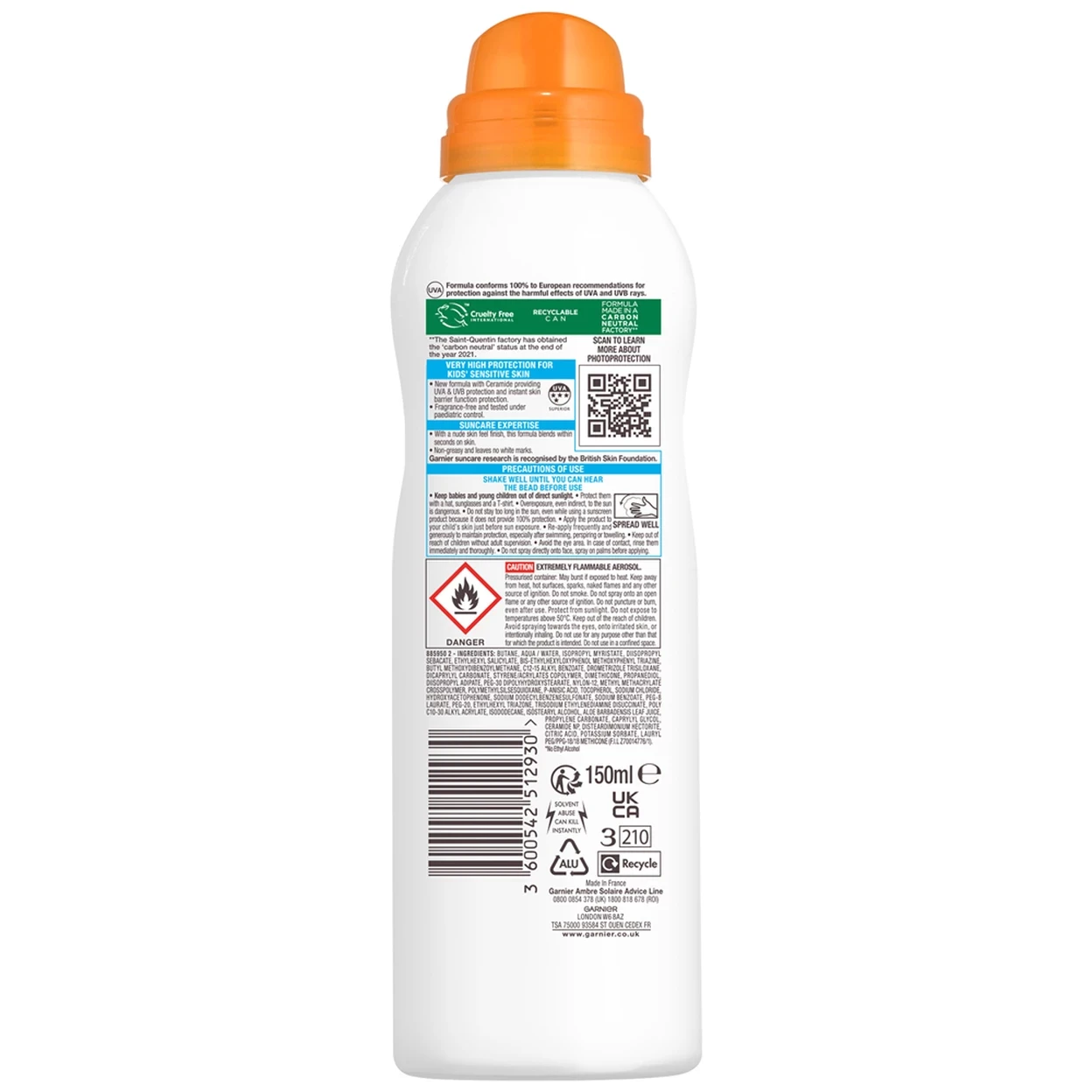 This product Garnier Ambre Solaire SPF 50+ Sensitive Advanced Kids Anti-Sand Mist 150ml immediately protects your kids from both short and long-term sun-induced damage. This very high protection sunscreen has a unique sand repelling action, so families everywhere can say no to that itchy sand feeling on skin. The fragrance-free lotion is especially developed for kids' sensitive skin and is hypoallergenic, to minimise allergy risk. With Ceramide, providing UVA and UVB protection and instant skin barrier function protection. The formula is non-greasy and fast-absorbing, is very water resistant and resistant to sand and sweat. The spray format allows you to protect your kids' skin from the sun quickly and easily. It can be used on body and face. The photostable formula has been tested under paediatric control and conforms 100% to European recommendations for protection against the harmful effects of UVA and UVB rays. Always keep babies and young children out of direct sunlight and protect your kids with a hat, t-shirt, and sunglasses as well as sun cream. Garnier suncare research is recognised by the British Skin Foundation.