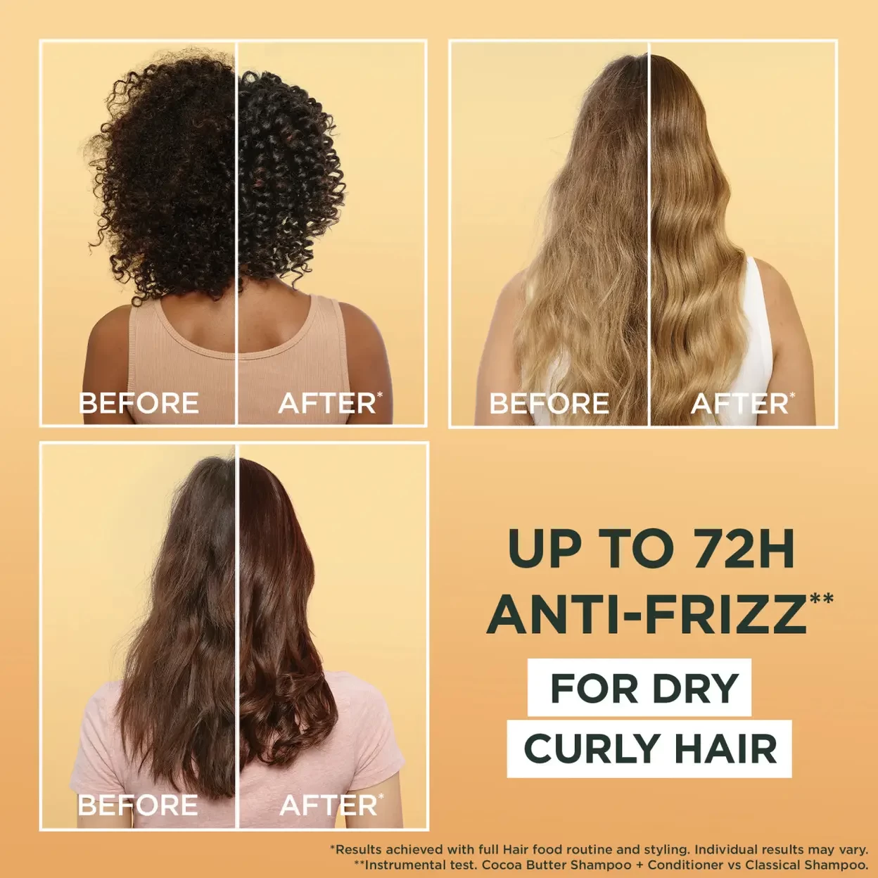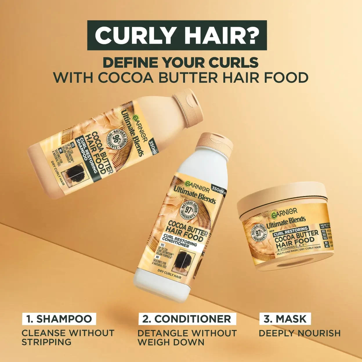 Garnier Ultimate Blends Cocoa Butter 3-in-1 is a versatile hair treatment designed for dry, curly hair. It functions as a pre-shampoo, conditioner, and hair mask, restoring curls with up to 72 hours of definition after just one use. The formula includes 97% natural origin ingredients and is enriched with Cocoa Butter for deep nourishment. With a 100% vegan formulation, this product contains no silicones, animal ingredients, or by-products, offering a natural feel. Approved by Cruelty-Free International, it aligns with ethical production standards. For optimal results, use this mask with the Hair Food Cocoa Butter Shampoo & Conditioner.