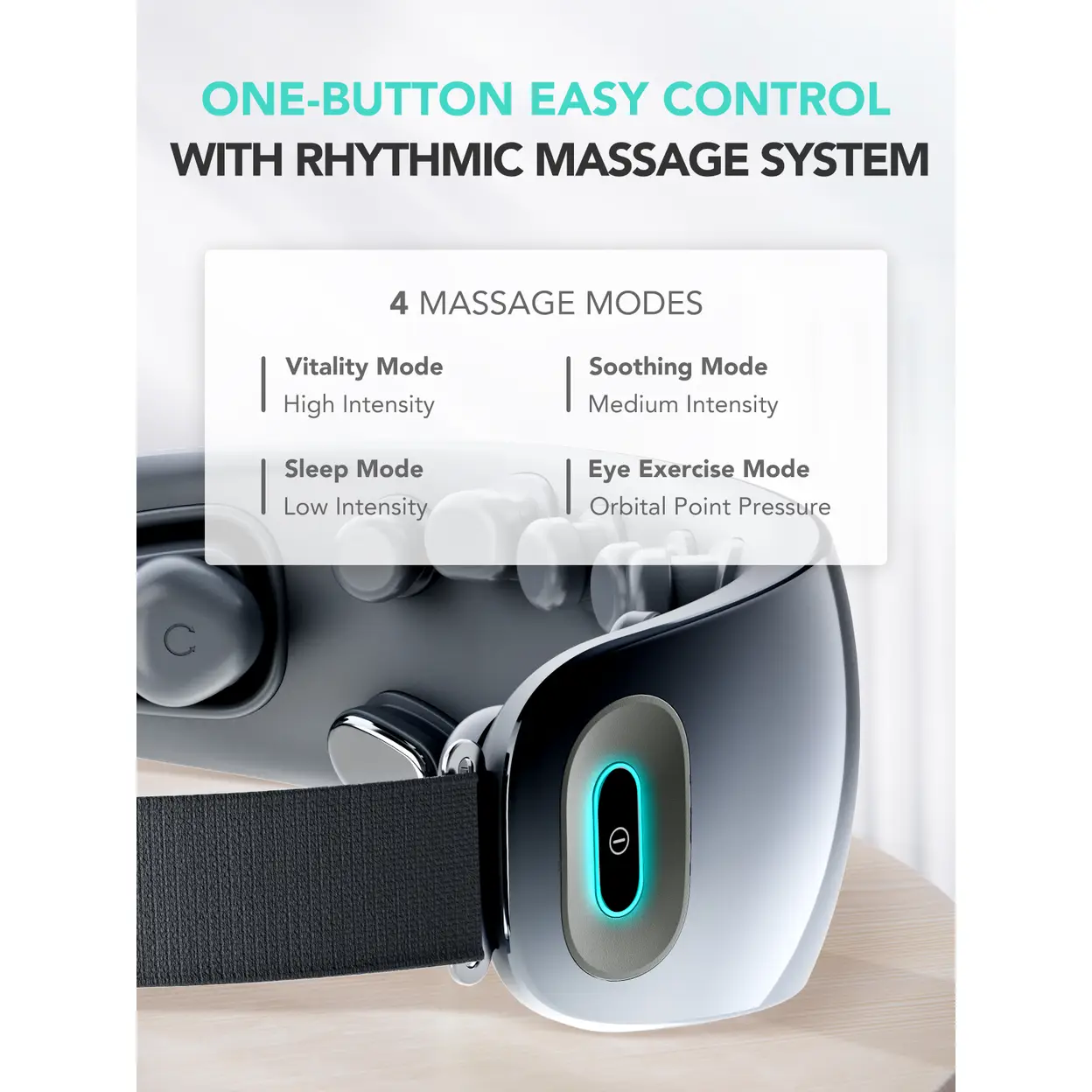 1. Full orbital + temple massage 2. Self-adaptive temple massage 3. 18 kinds of finger massage techniques 4. 12 independent micro-vibration massage motors 5. 3-second fast warm compress 6. A variety of massage modes 7. Technologically cool appearance 8. Lightweight and durable 9. Music to relax as you like