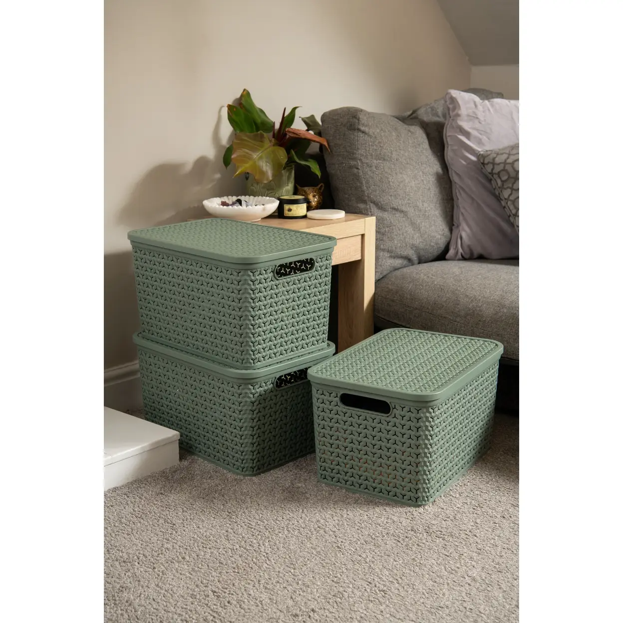The Strata Large Urban Store Basket with Lid is expertly manufactured from strong, durable recycled plastic, combining environmental responsibility with long-lasting everyday performance. The robust construction ensures the basket maintains its shape even when fully loaded, while the contemporary woven-effect exterior adds visual texture without compromising strength.