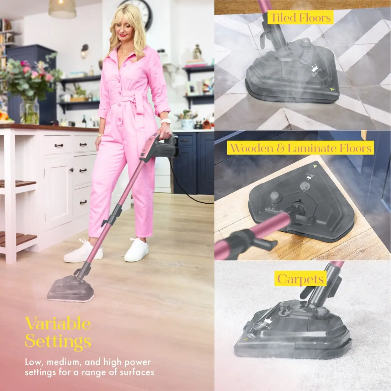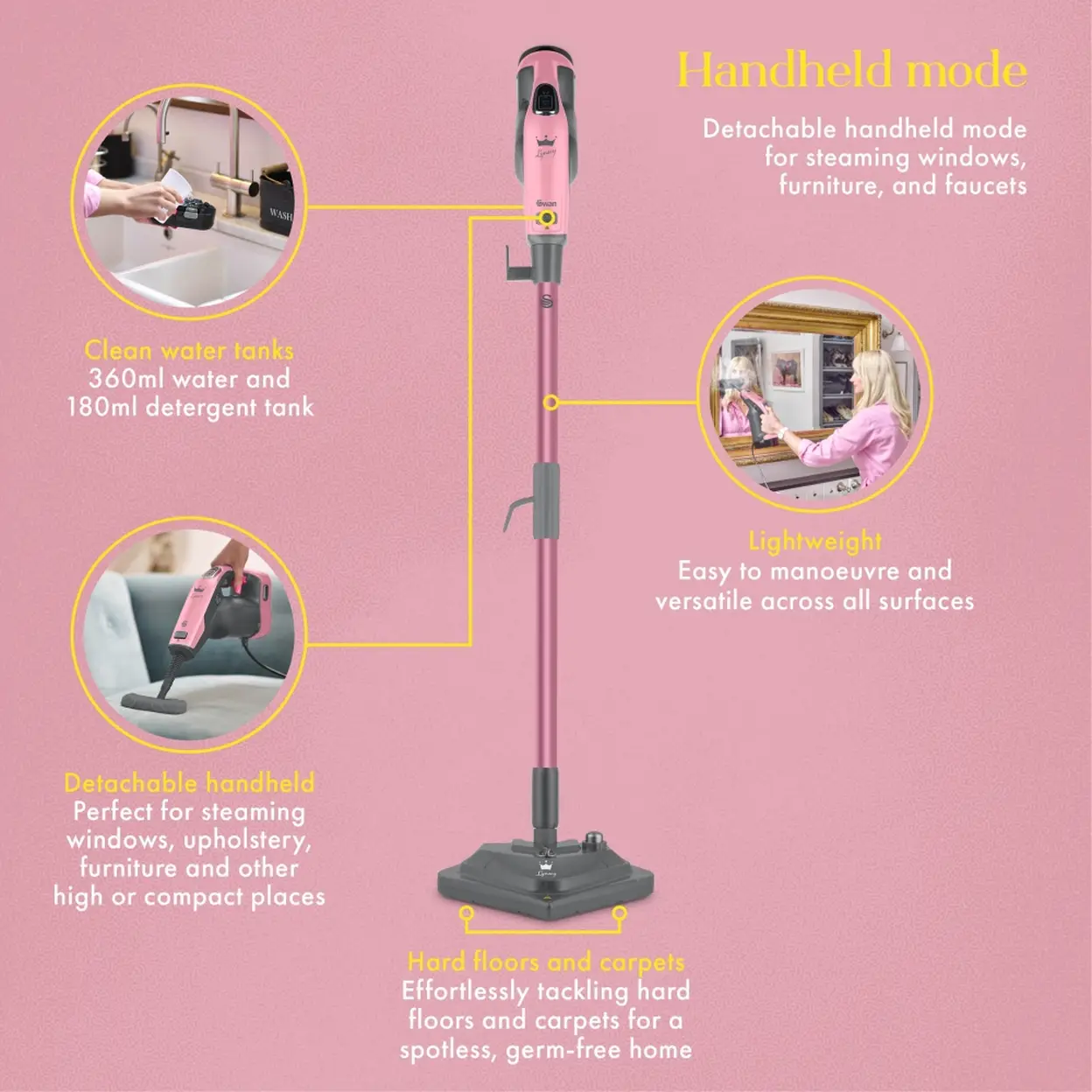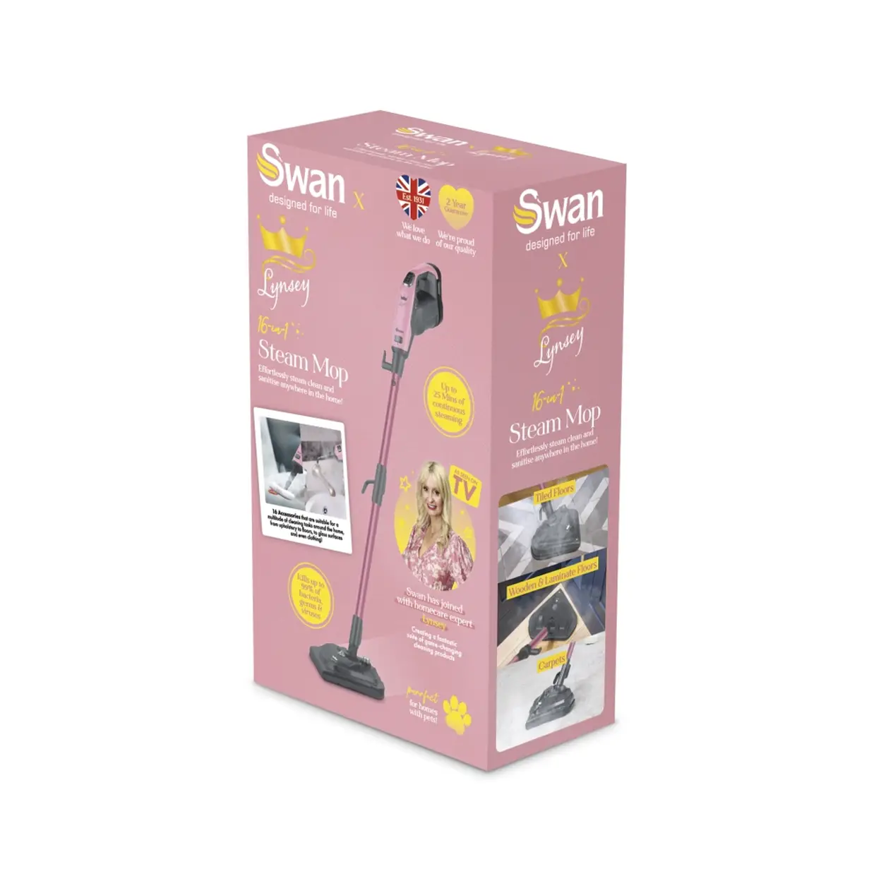 The Swan SC30131QOC steam mop is brought to you by Lynsey Crombie, TV’s Queen of Clean and all-round cleaning guru. Its detachable handheld mode and versatile cleaning options have earned Lynsey’s crowning stamp of approval. Featuring multiple steam settings, it offers three steam power levels to clean a wide range of surface types and materials, including carpets, wood floors, windows, furniture, and more. Enjoy up to 25 minutes of continuous steaming from one fill of the tank, giving you more than enough time to take on all the floors in your house efficiently.