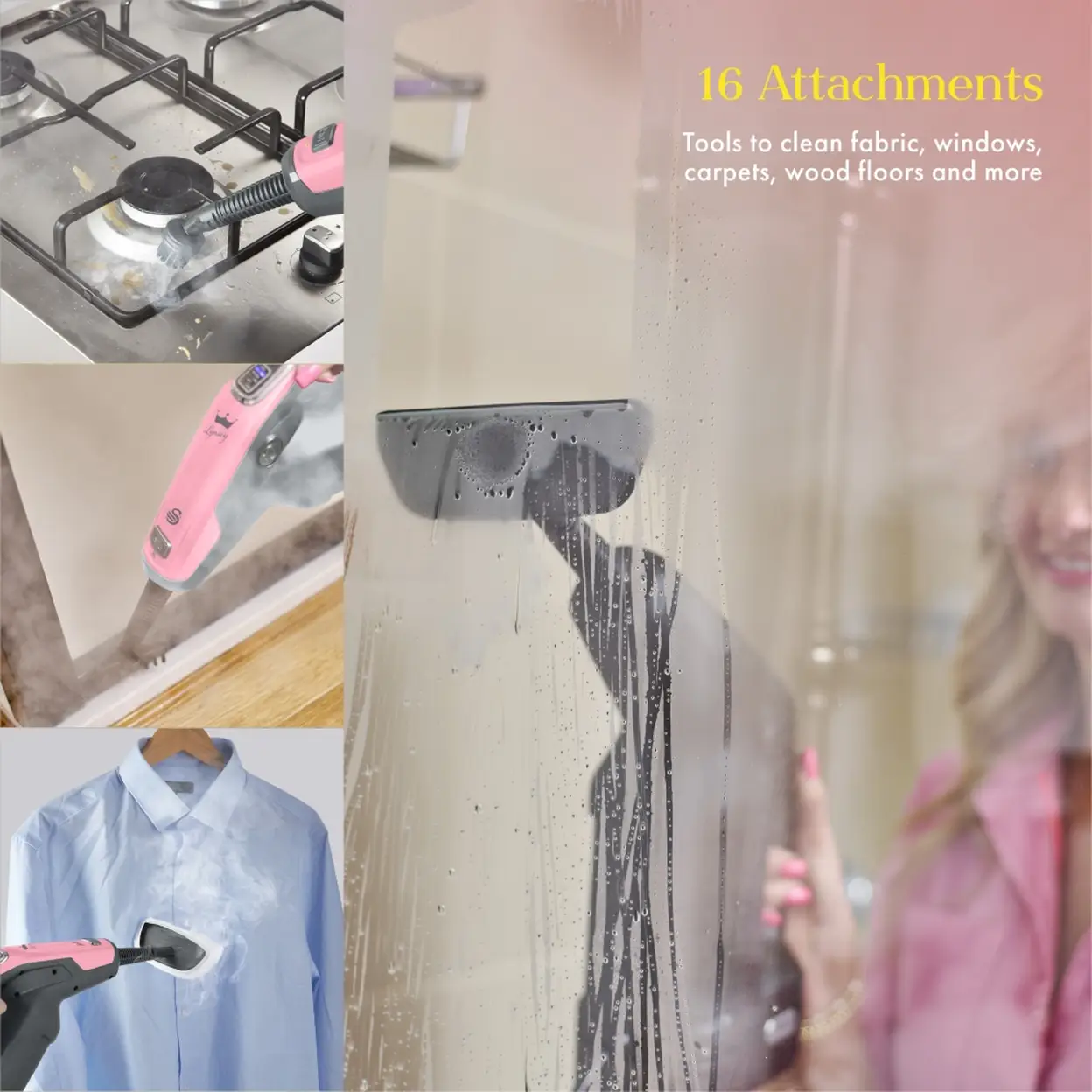 16 accessories included for floor-to-ceiling cleaning