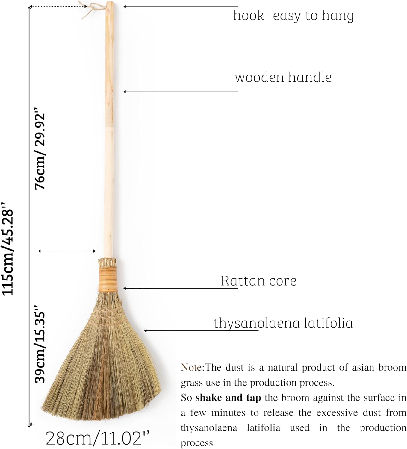 Vietnamese Natural Whisk Broom - Straw Soft Broom - Long Handle Broomstick for Cleaning, Decoration, Wedding with 45.28 inch Length
