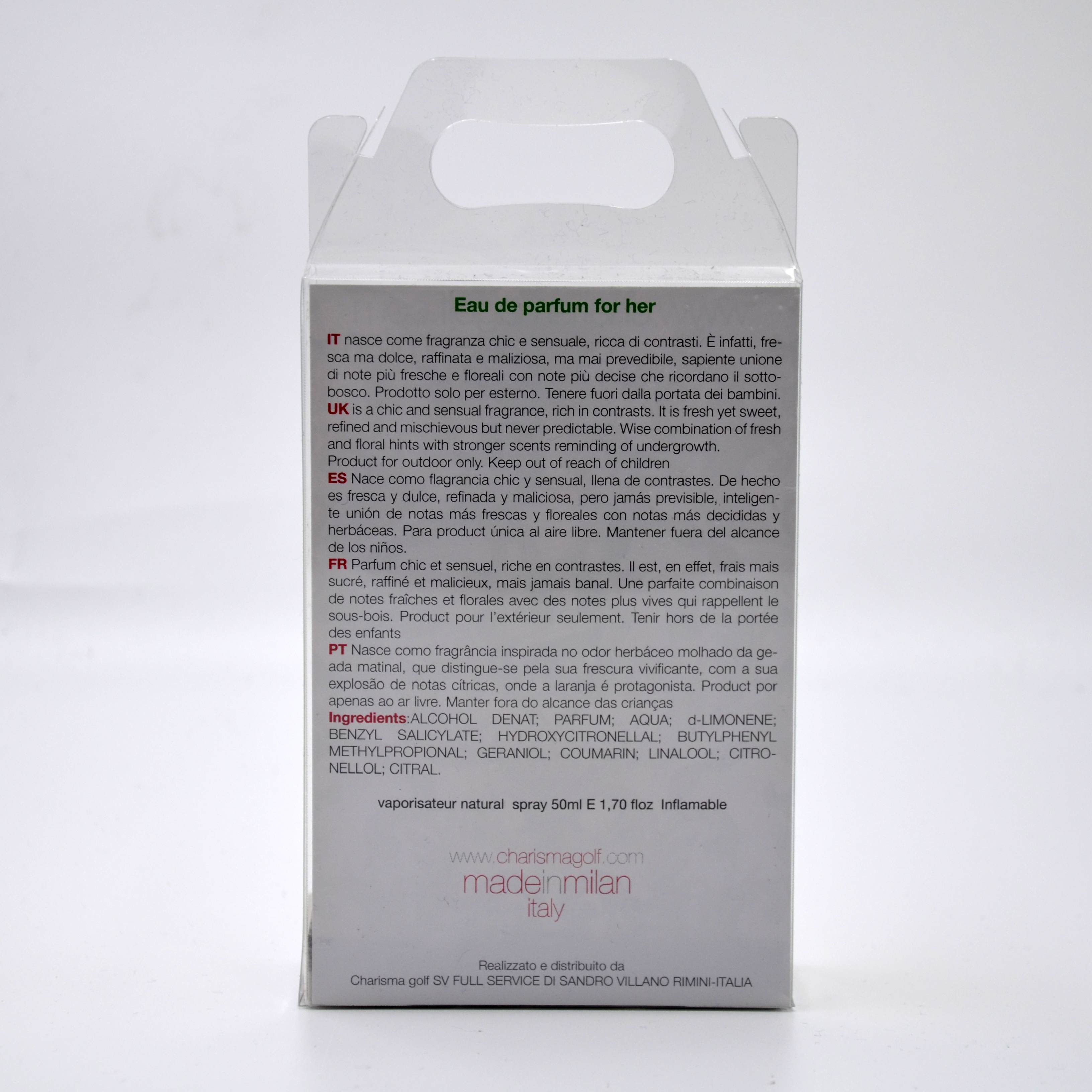Charismagolf for her, is a chic and sensual fragrance, rich in contrasts.