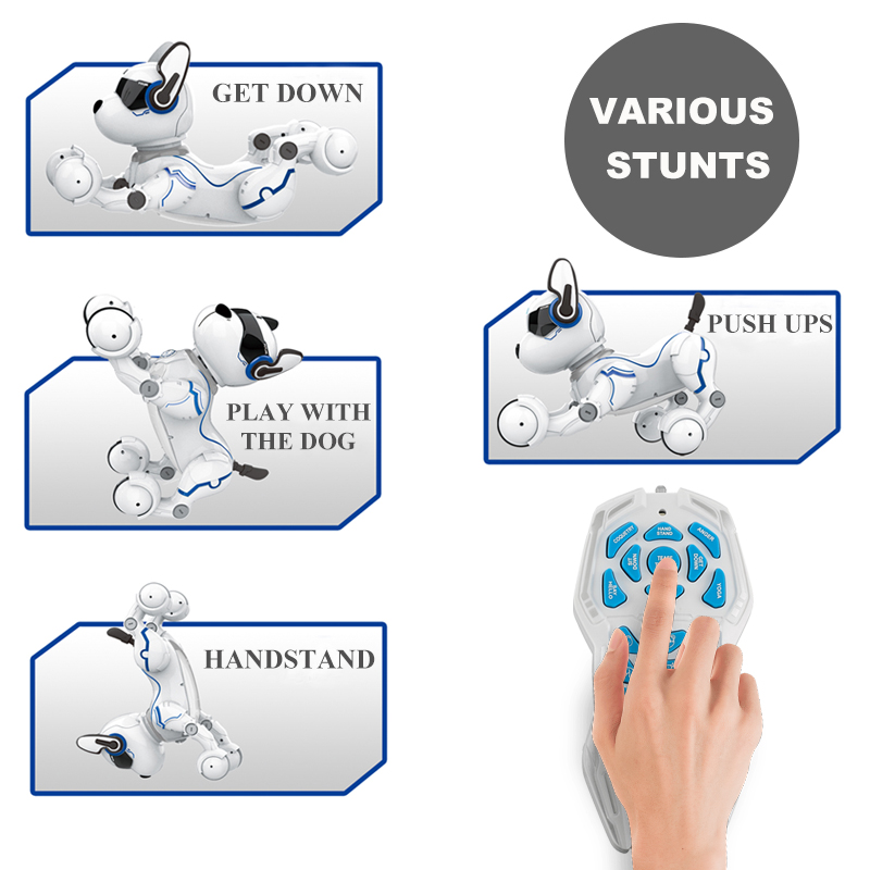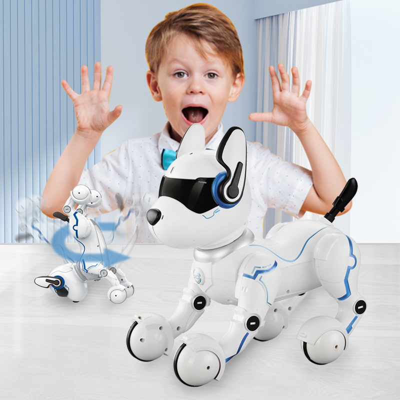 Remote Control】: You may operate the intelligent robot dog and let it do different actions by using the remote control. You may give voice commands to the robot dog. It will respond you like a real dog with the vocal commands.the robot puppy will act like a child and walk around to perform the programming actions. 【Various Actions & Imitation】: The Intelligent robot dog can imitate different animals' forms, just press the "IMITATE" button, this little puppy will imitate the calls and movements of the other animals, It will make your kids laugh for sure. 【Smart Robot Dog】: Intelligent robot dog is an intelligent and highly emulational puppy toy. The puppy's feet are in spherical, it makes you feel the robot dog more realistic. 【Advanced Programming Educational Toy Dog】: Intelligent robot dog is programmable, you can program the actions as you like to train this robot puppy. Just press the button "Programming", you can self program the actions. Pressing the button again, the dog will repeat what you programmed. The programmable robot dog can develop children's brain and improve their intelligence.