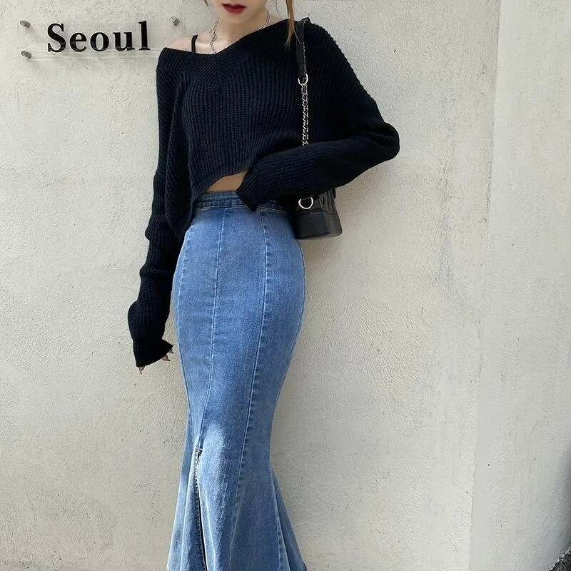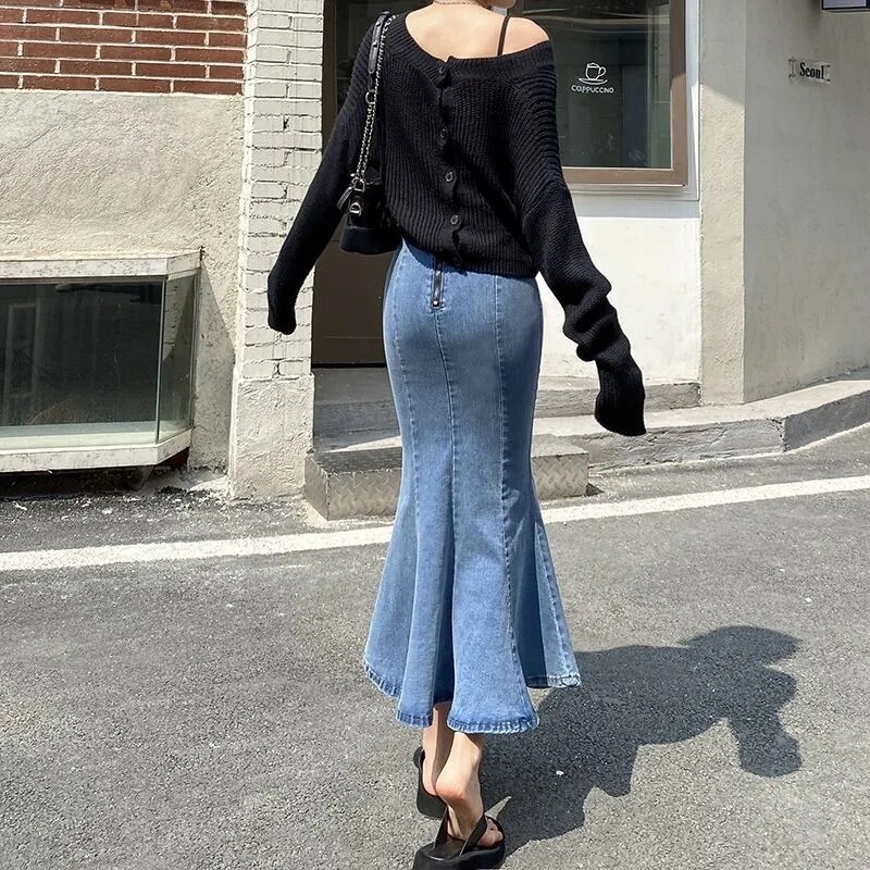 HolidayQueen New Spring and Summer Denim Skirt Female Design Sense High Waist A-line Ruffled Mid-length Bag Hip Fishtail Skirt Free Shipping HQP0126