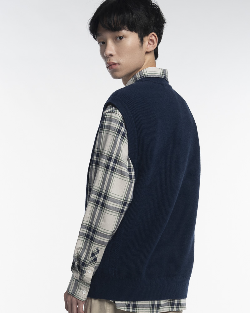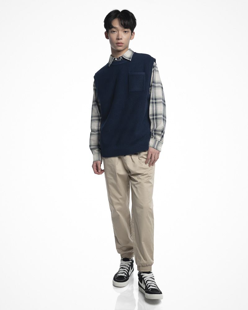 Regular Knitted Round Neck Vest with Ribbed Texture Details and Hem. Comes with Chest Pocket at the front. Made of cotton.