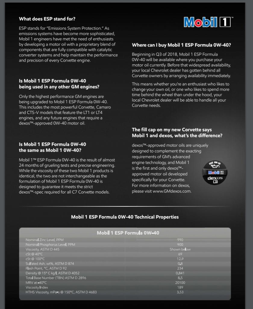 Mobil 1™ ESP Formula 0W-40 is the first and only dexos™ approved motor oil developed specifically for Chevrolet Corvettes. It is recommended for all C7 Corvettes* for both track and street use.