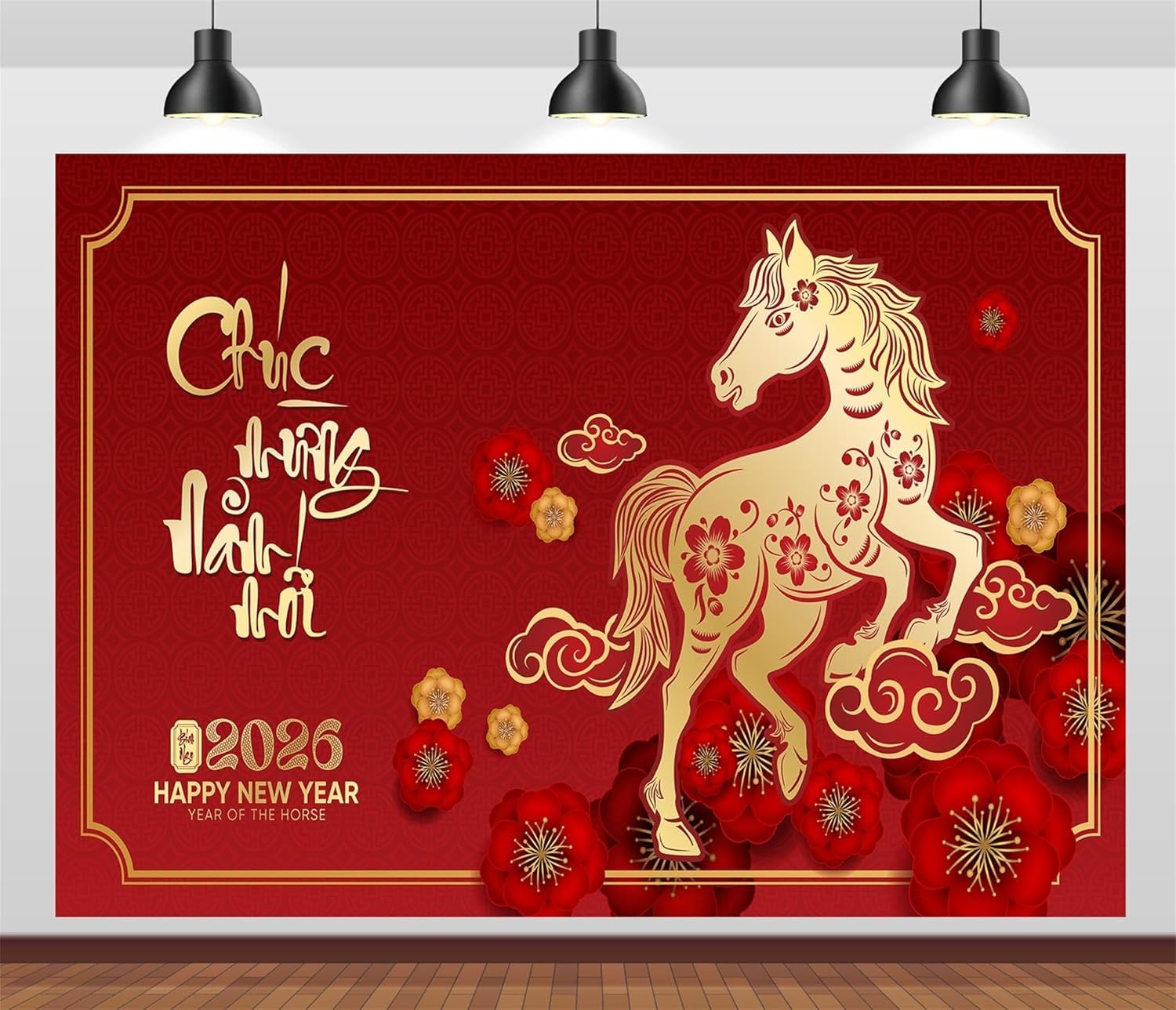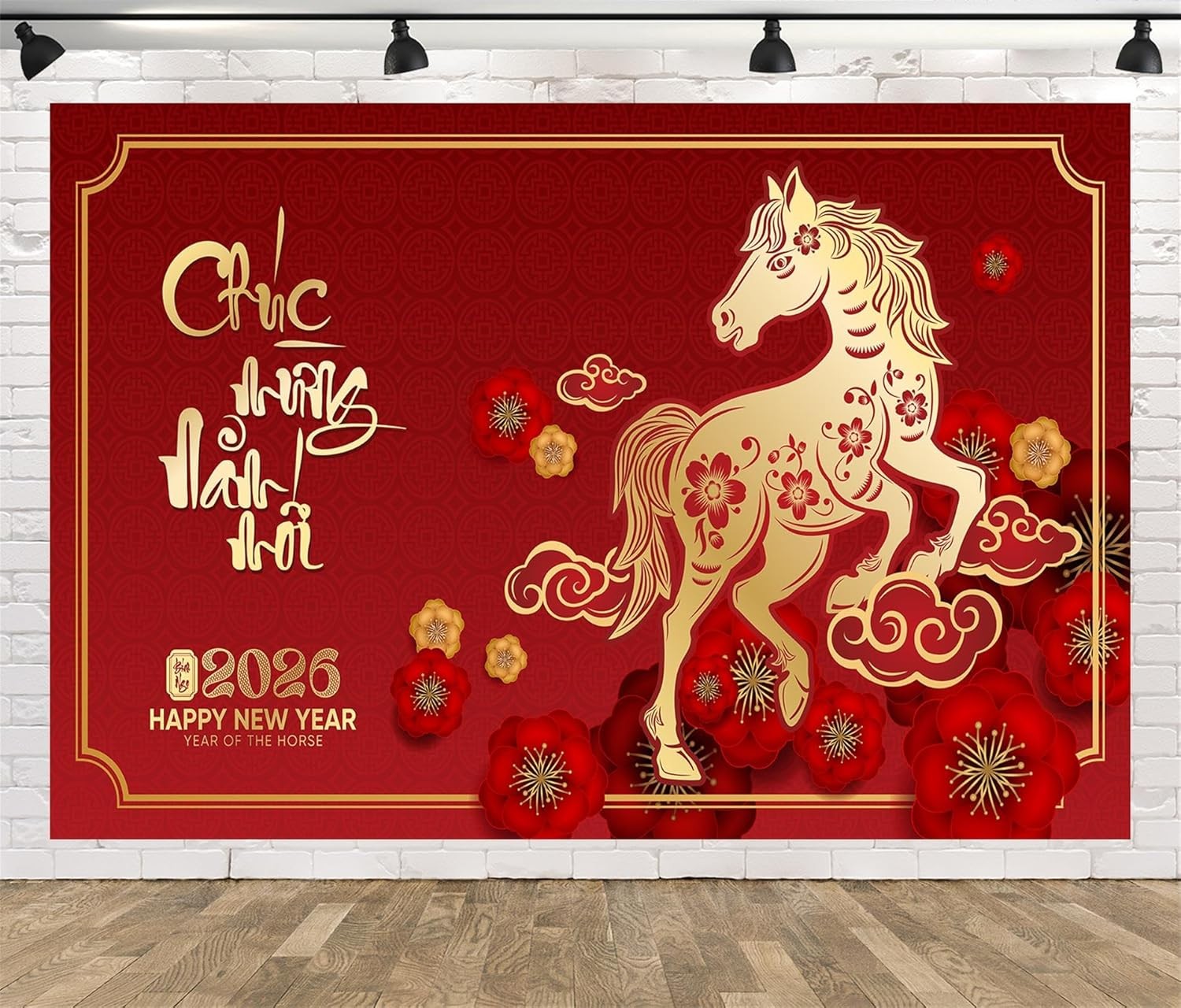 BELECO 8x6ft Fabric 2026 Vietnamese New Year Backdrop Year of The Horse Vietnam Lunar New Year Backdrop TET Decorations Banner Asian Spring Festival Photoshoot Studio Props