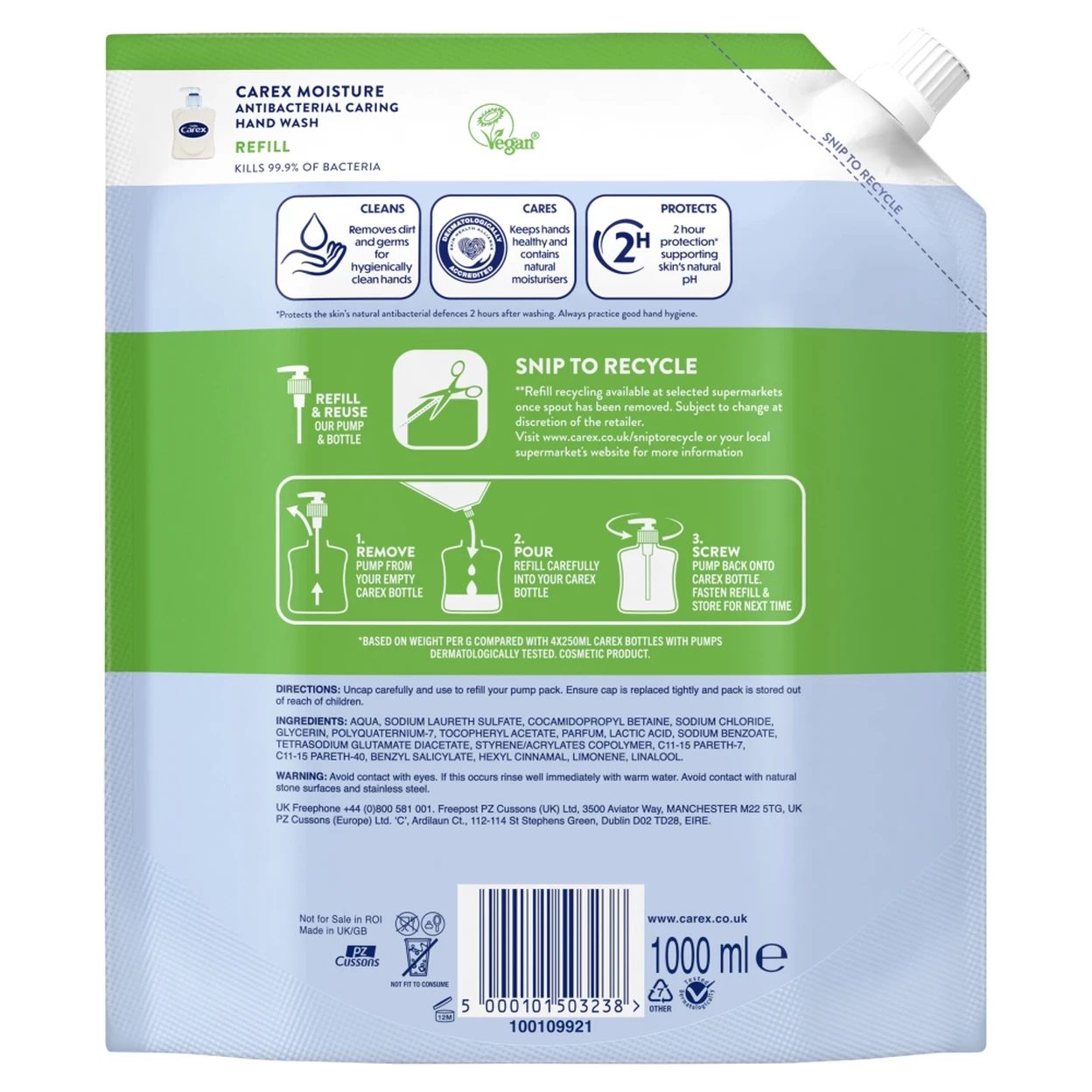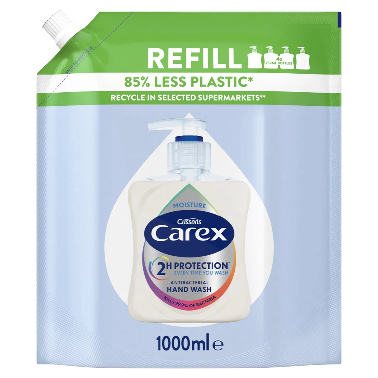 Eco-friendly 1L refill pouch uses 85% less plastic than four standard 250ml bottles.