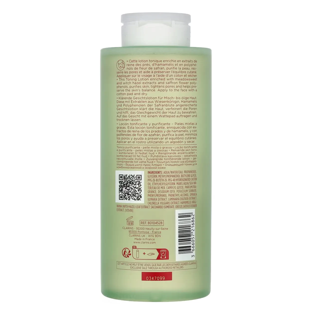 Clarins Purifying Toning Lotion 400ml is a refreshing, plant-based toner specially developed for combination to oily skin types. This alcohol-free formula perfects the cleansing process by removing any remaining impurities after cleanser, while delivering active ingredients that balance and refine the complexion . At the heart of the formula lies Clarins' innovative [Microbiote Complex], which combines polyphenols from organic saffron flowers with a marine-based prebiotic derived from laminaria to help preserve and protect the skin's natural microbiome balance . The toner is further enriched with meadowsweet extract to help regulate excess sebum production and minimize shine, while witch hazel extract provides gentle astringent benefits to tighten the appearance of pores and refine skin texture . With each application, the lightweight, comforting texture leaves skin feeling purified, refreshed, and perfectly balanced—soft, shine-free, and visibly refined. The senses are refreshed with delicate fruity-floral notes of citrus, blackcurrant, peach rose, and jasmine . Dermatologist-tested and free from parabens and colorants, this purifying toner is an essential step for those seeking a clear, healthy-looking complexion . To reduce its environmental footprint, Clarins has redesigned this product in an eco-friendly bottle that is also available in a refill format .