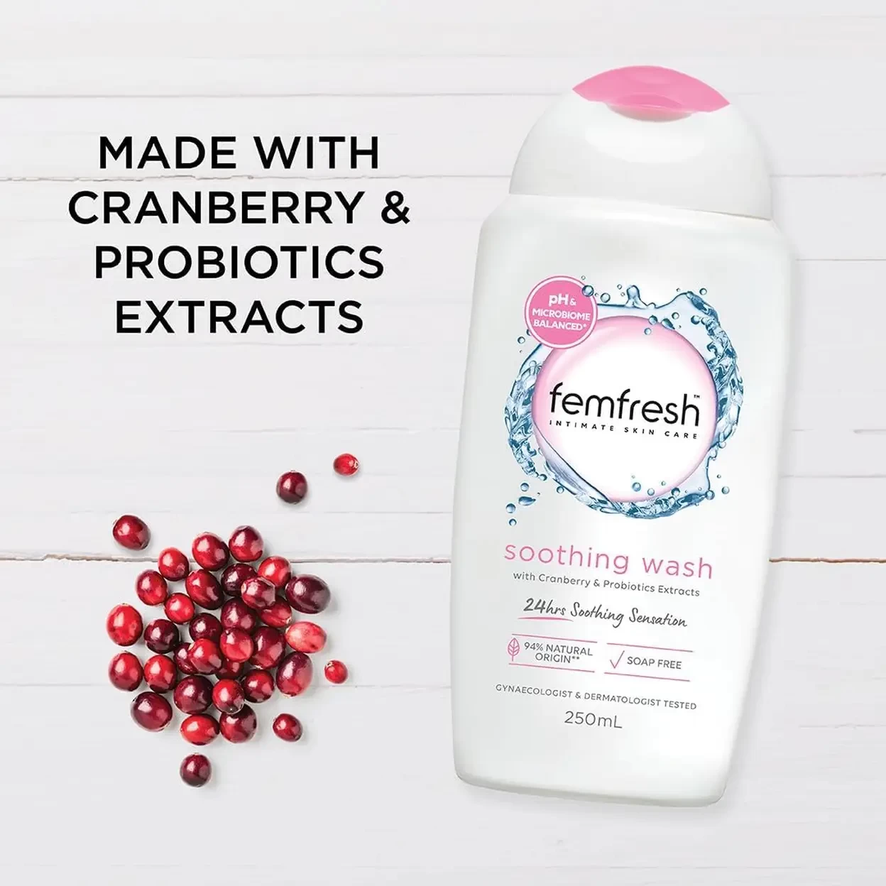 Femfresh Soothing Intimate Wash 250ml is a gentle, everyday solution for feminine hygiene. Crafted with 94% natural origin ingredients, including cranberry extract and probiotics, this wash soothes, hydrates, and helps strengthen your intimate skin¡¯s natural defences. Its soap-free, pH-balanced formula is designed to match the natural environment of intimate skin, supporting the skin¡¯s microbiome and providing 24-hour hydration for lasting comfort. Dermatologically and gynecologically tested, it is suitable for daily use and leaves you feeling fresh, comfortable, and confident. Ideal for those seeking a natural, gentle, and effective approach to intimate care.