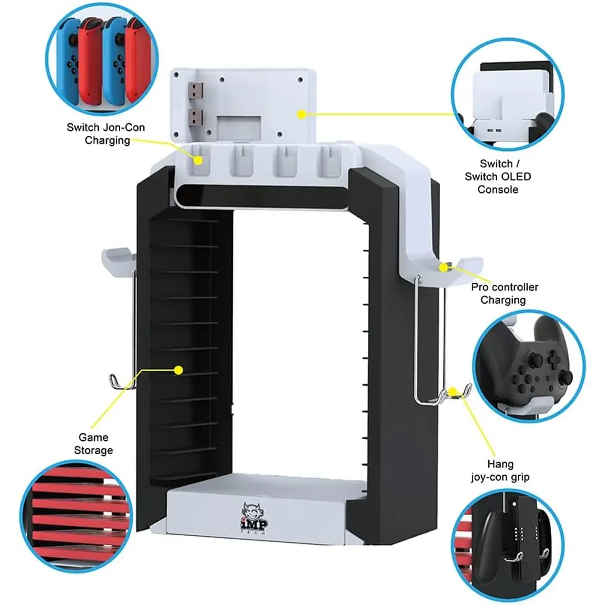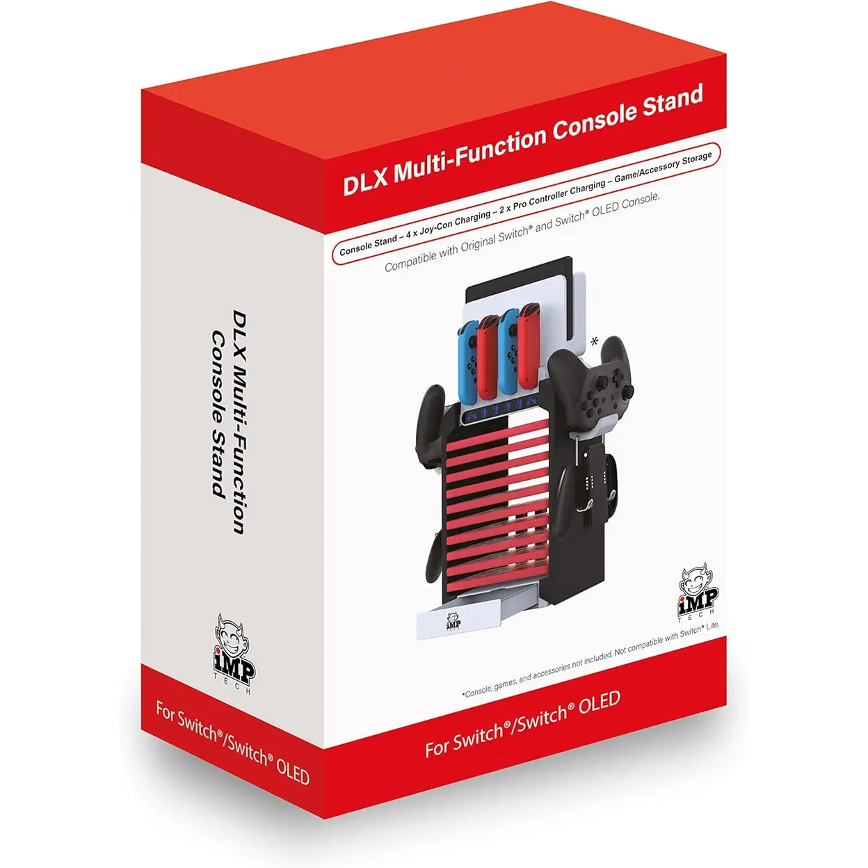 The iMP Tech DLX Multi-Function Charging Tower is the ultimate all-in-one organizing and charging solution designed exclusively for the Nintendo Switch gaming setup. Far more than a basic stand, it functions as a sleek, stylish, and highly practical hub that elegantly charges, stores, and displays your console and all essential gaming accessories in one unified space. Thoughtfully engineered with maximum convenience and space efficiency in mind, this compact tower consolidates your Switch, controllers, games, cables, and other accessories into a clean, organized, and clutter-free station. Its durable construction and modern design blend seamlessly into any gaming area, keeping your gear secure, tidy, and always within easy reach. By centralizing charging and storage, it eliminates messy cables and scattered equipment, ensuring you spend less time setting up and more time gaming. Whether at home or in a dedicated gaming space, the iMP Tech DLX Charging Tower delivers a polished, efficient, and user-friendly experience, making it an indispensable upgrade for any Switch owner seeking order, functionality, and premium presentation for their gaming setup.
