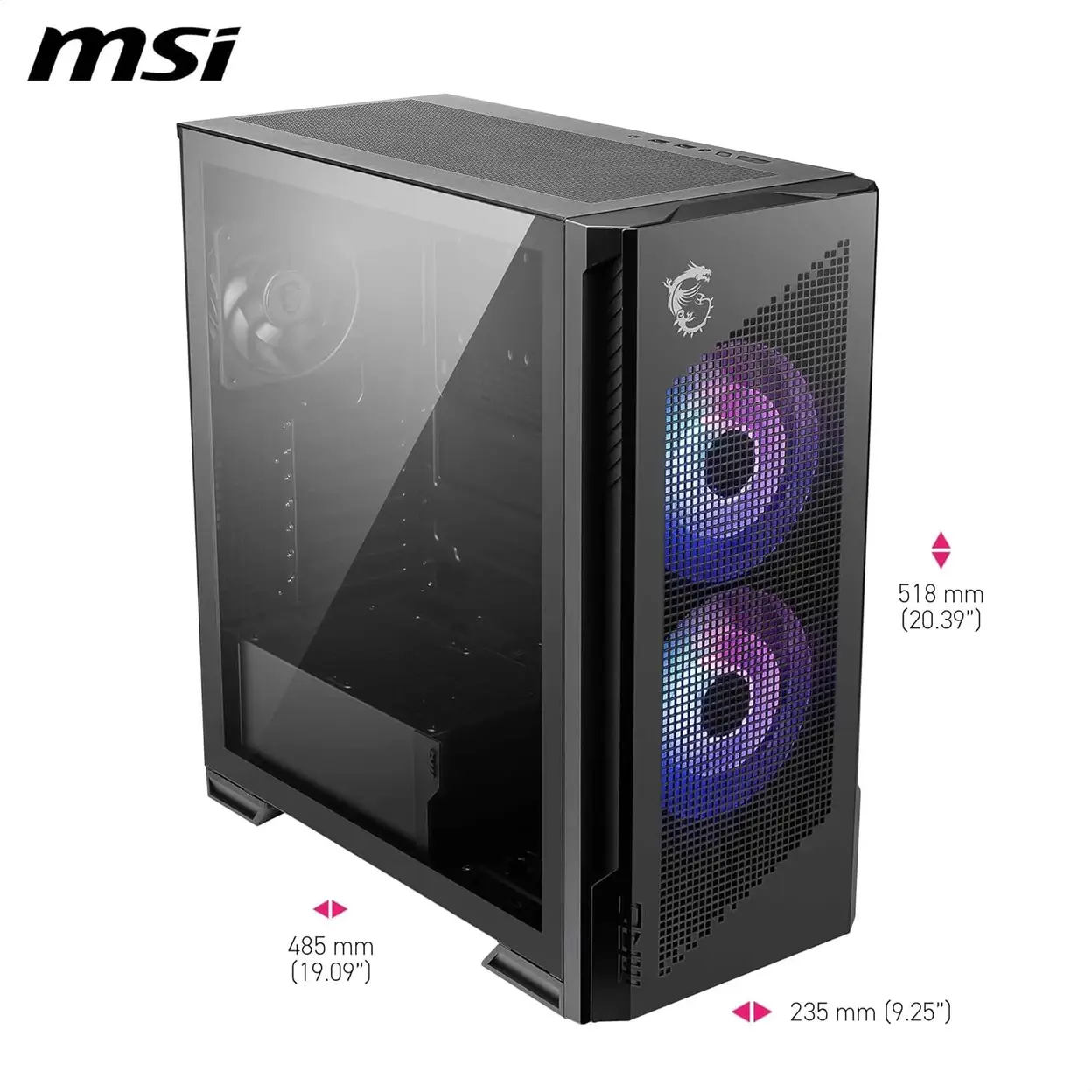 • Tempered Glass Side Panel— Showcases your build with a tempered glass side panel, providing a clear view of your components and RGB lighting.