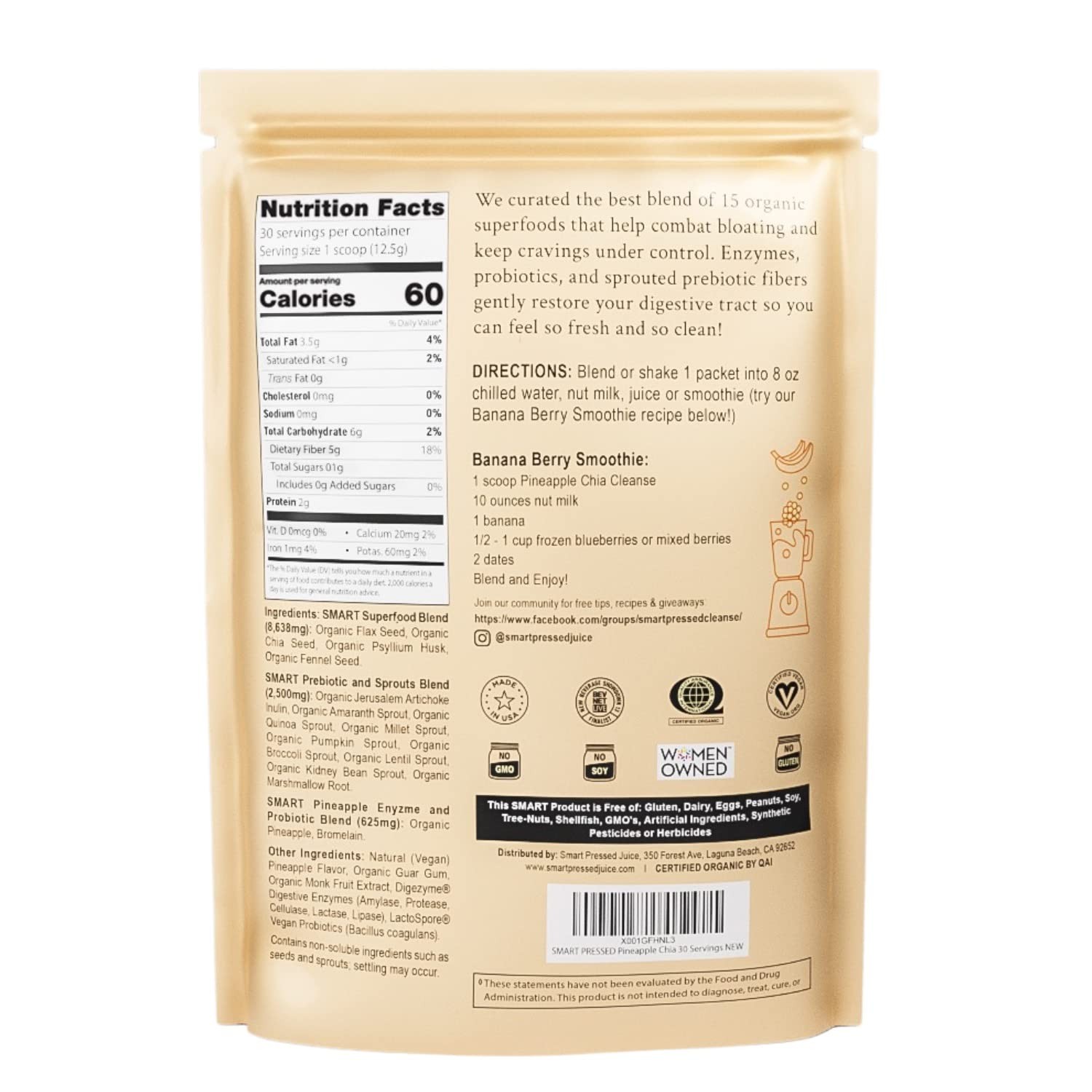 SMART Pressed Juice Pineapple Chia Cleanse | Prebiotic Superfood Plant Based Fiber with Vegan Probiotics & Enzymes | Pineapple Juice Cleanse for Women & Men | 30 Servings