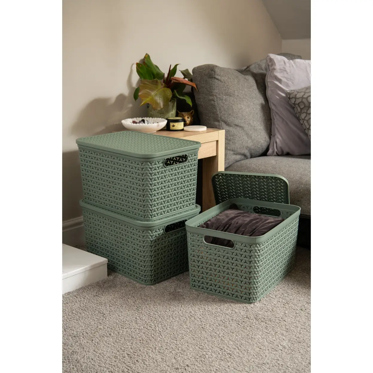 The Strata Large Urban Store Basket with Lid is expertly manufactured from strong, durable recycled plastic, combining environmental responsibility with long-lasting everyday performance. The robust construction ensures the basket maintains its shape even when fully loaded, while the contemporary woven-effect exterior adds visual texture without compromising strength.
