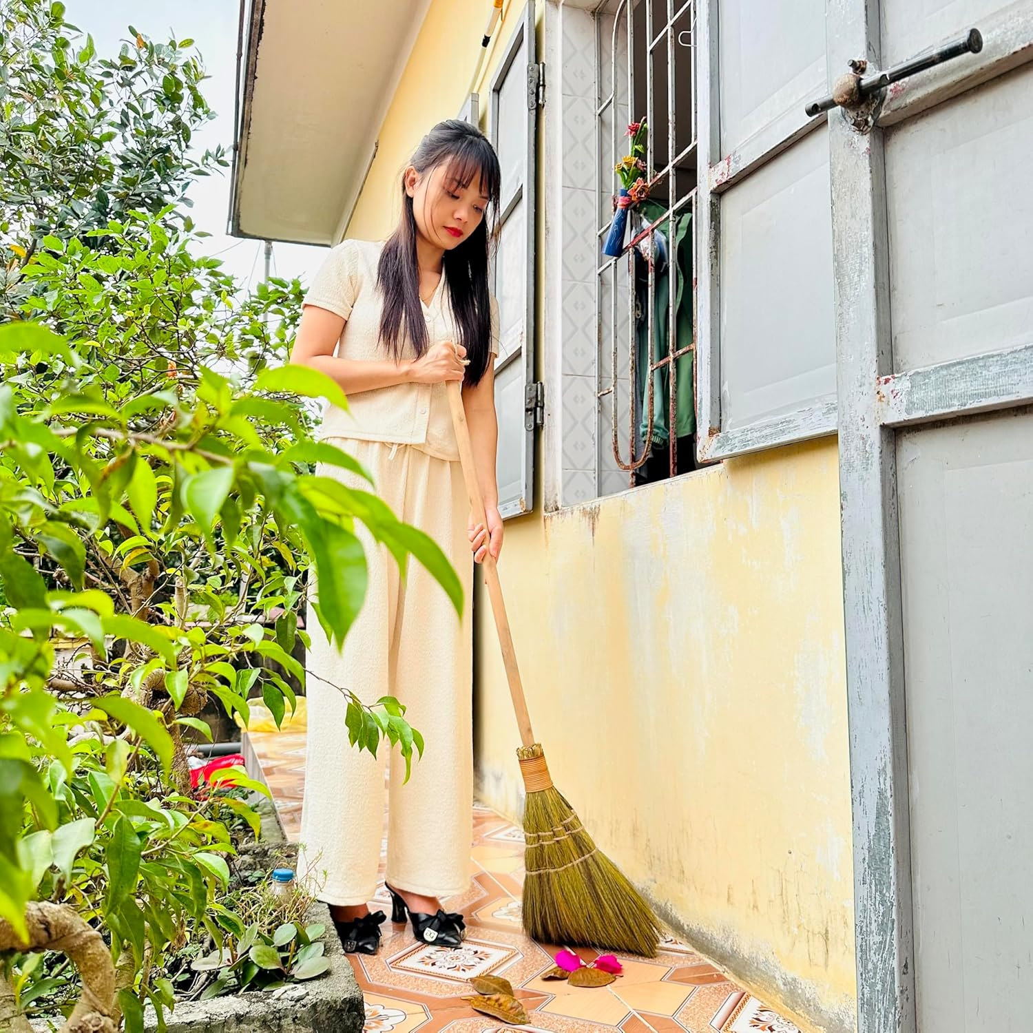 Vietnamese Straw Soft Broom for Cleaning with Long Handle Broom- Broom Decorative 9.45'' Width, 45.28" Length